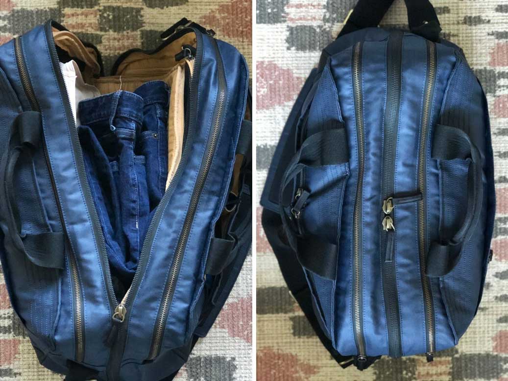 - The design is thoughtful and clever. The bag opens like a clamshell (in the middle). This makes packing so much easier, and you can fit in a lot more than you think.